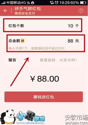 3、最后,只需要我们输入红包个数和总金额以后,就可以塞进红包,发到微信群里面: