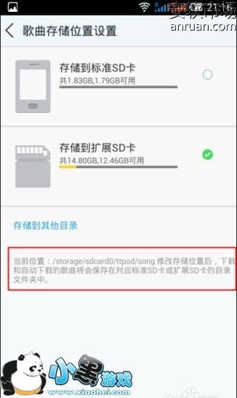 3、我们可以看到天天动听提供的保存歌曲的两种模式:如果你手机没有扩展SD卡:那么就是在【 手机内存的/ttpod/song 】文件夹中;如果你的手机有扩展SD卡,那么就是在【 /sdcard0/ttpod/song 】文件夹中:
