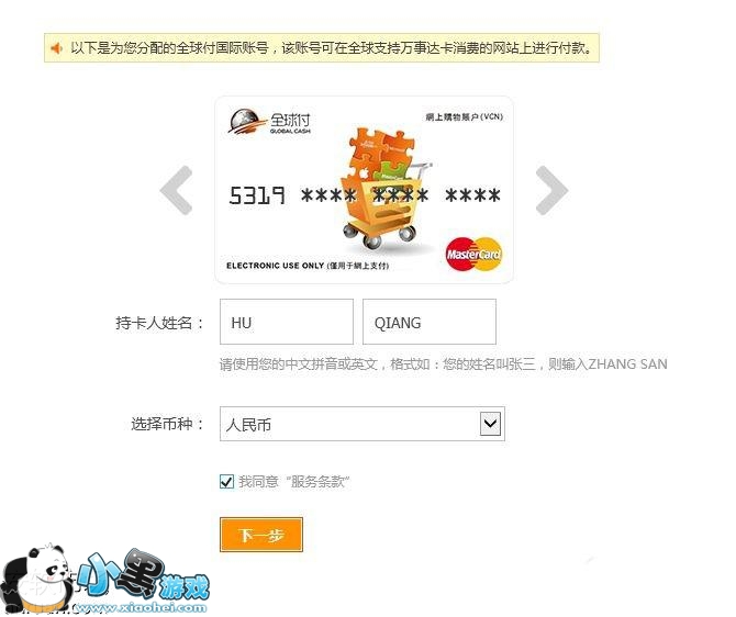 开通过程比较简单:进入全球付首页后点击右上角的「免费获取」字样进入注册过程,根据提示和要求填写相关信息、绑定手机号码并进行首次充值即可。