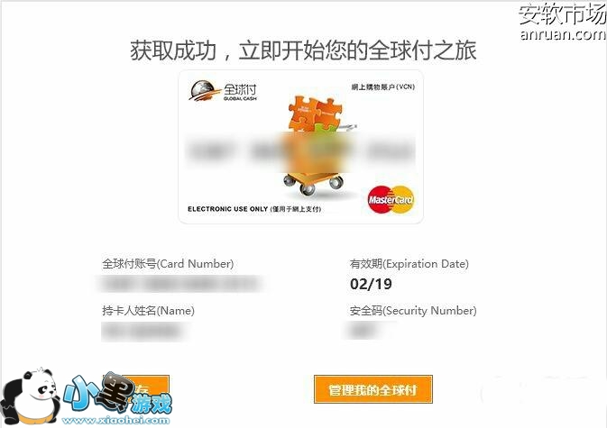 填写我们在全球付上获取的虚拟信用卡信息(卡号、有效期、安全码等等);
