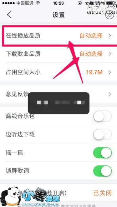 3、进入到虾米音乐设置界面以后,界面最上面就有一个功能是设置在线播放品质的,一般默认的情况下是自动选择的,点击这个功能进入,如下图。