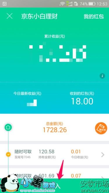 2、进入到京东小白理财界面以后,可以看到以前的累计收益以及今日收益等相关信息,点击界面最下面转入按钮,如下图。