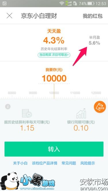 3、此时就可以看看到京东小白理财天天盈、半月盈、历史年化收益了,点击半月盈这个功能进入,如下图。