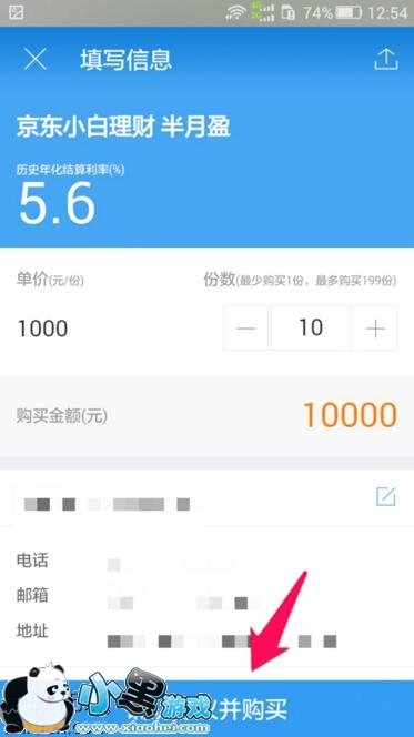 5、在京东小白理财的半月盈购买界面可以选择购买金额以及自己的其它详细信息,没问题就点击购买。