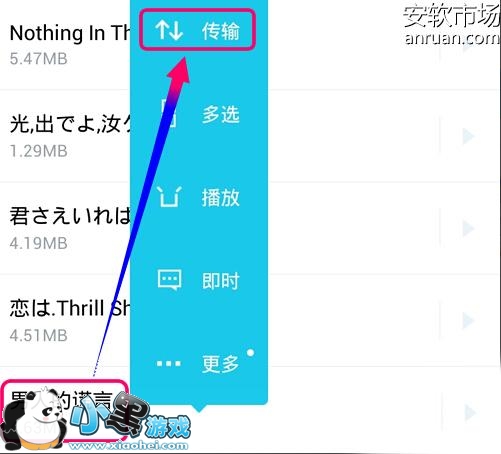 6、点击需要传送的文件,会弹出一个菜单选择,点击其中“传输”这个按钮即可。