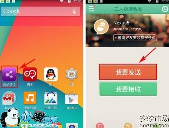 1、在小黑市场下载茄子快传然后安装,安装好以后打开茄子快传客户端,进入到茄子快传主界面,点击主界面上的“我要发送”按钮,如下图。