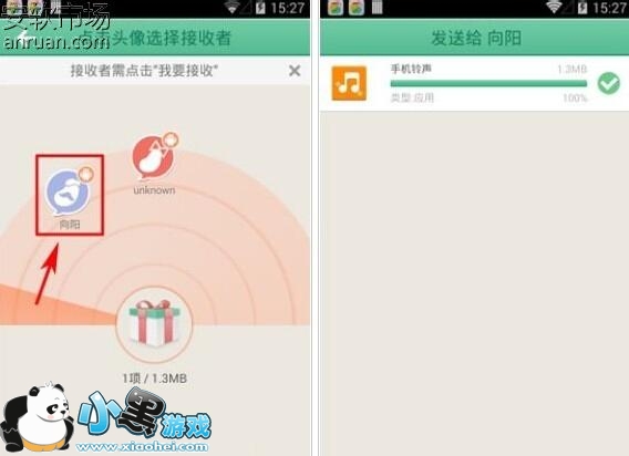 3、在搜索到要分享的好友以后,点击好友的头像,就只需等待分享的内容发送完成就可以了。当然在我们给好友传送文件的时候,自己的好友同时也要点击“我的接收”按钮,这样自己我们才能搜索到好友。