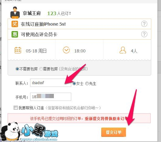 3、然后输入预订人的名字和联系方式,点击提交订单。如果你是帮别人订座的话,那就在联系人那里输入别人的联系方式。
