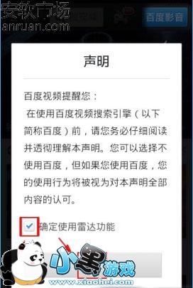 1、首先下载并安装百度视频,接下来打开百度视频后出现百度视频的声明,看到确定按钮上面有个选择项,选择是否使用雷达功能,如果确定使用的话可以直接点击确定按钮,不使用的话点击那个选择项去掉勾,再点击确定按钮就可以了。小编开始也没有勾选它;