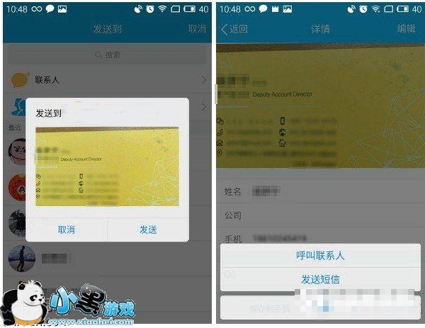 扫描纸质名片后除了可以直接分享电子名片外还可以打电话或发信息,功能还是比较强大的,如图。