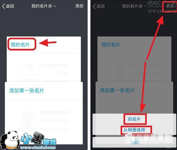 2、之后点击「我的名片」,之后可以选择使用相机「拍名片」或者直接在相册中选择已经保存的「名片」相片,如图。