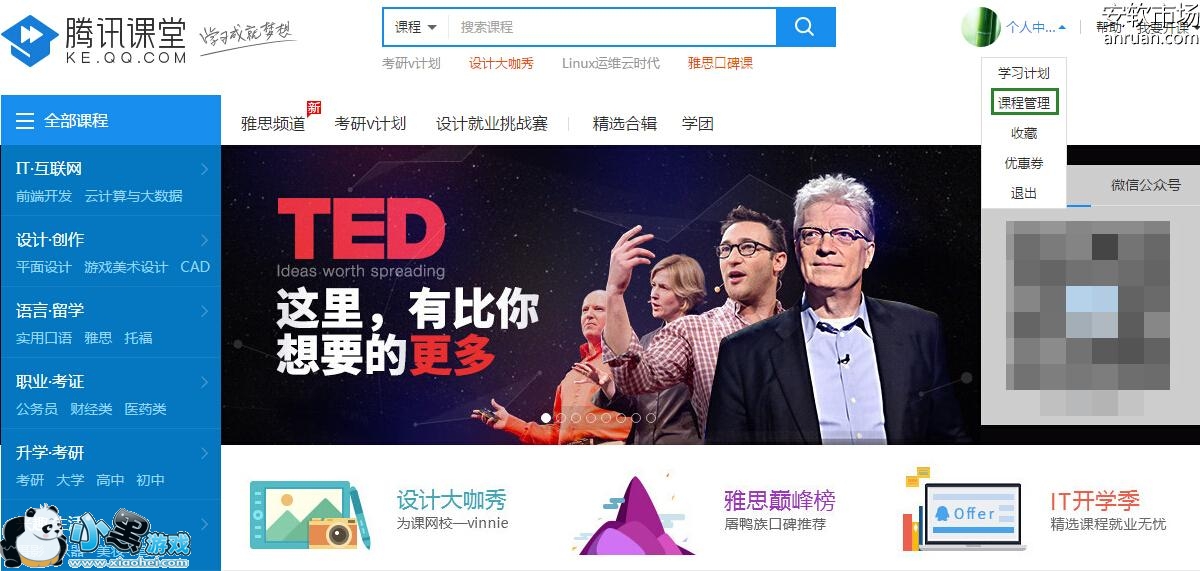 2、登录成功以后,点击个人中心按钮旁边的倒三角符号,这时可以看到一个下拉菜单框,其中有一个课程管理的功能,点击该功能进入,如下图。