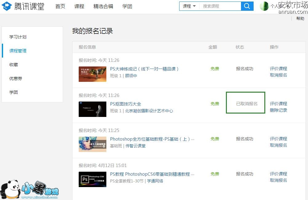 5、再回到腾讯课堂课程管理的报名记录界面中,可以看到那个取消报名的课程的报名状态已经变成已取消报名。