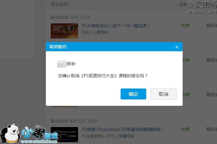 4、此时会淡出一个取消报名的提示窗口,提示您是否取消该课程的学习,点击“确定”按钮即可。