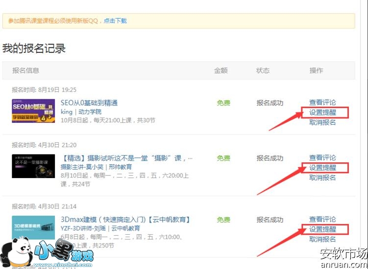 3、进入以后可以看到我们报名的课堂记录,在该课程右边还有一个设置提醒的按钮,点击该按钮,如下图。