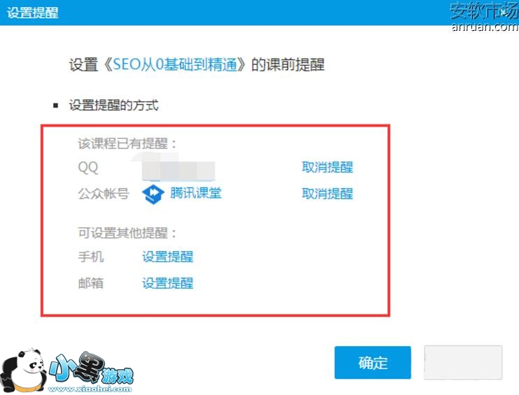4、进入到该课程的设置提醒界面以后,可以看到当前课程设置的提醒方式以及我们设置的提醒方式,如果要把该提醒方式去给取消掉,就点击其旁边的取消提醒按钮,然后点击确定按钮即可。