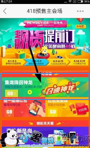 苏宁418年会召唤神龙是什么 1、首先,下载小黑市场最新版的苏宁易购,点击上方的横幅,进入418年会主会场,如图所示: