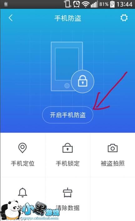3、进入到手机防盗界面就能看到开启手机防盗这个功能,点击该按钮进入,如下图。