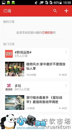 2、进入到订阅界面以后,可以看到当前自己的订阅栏目是空的,点击界面右上角“+”这个按钮,如下图。