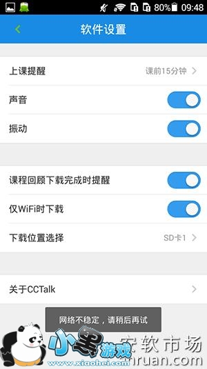 3、进入到软件设置界面以后,可以看到当前沪江CCTalk下载选择的位置,默认情况下是下载到手机内存上,所以这也是为什么手机变卡的原因,点击下载位置选择这个功能,如下图。