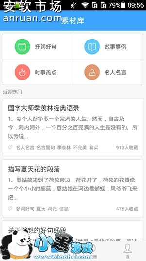 2、点击素材库进入到素材库界面,在素材库中有很多写作的素材你可以使用,找到一些你觉得比较好的素材点击进入,如下图。