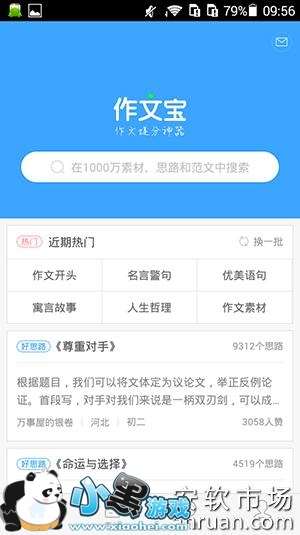 1、打开作文宝客户端,进入到作文宝主界面后,可以看到近期一些写作热门推荐,如下图。