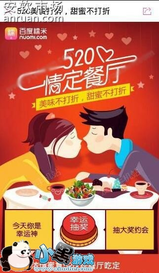 百度糯米在5月20日推出了情定餐厅的幸运抽奖活动,活动内容当然是为情侣提供良好的服务。当情侣们选择好在哪里共享晚餐以后,直接使用百度糯米团购,在520情定餐厅我们可以抽奖获得更多的礼品哦。