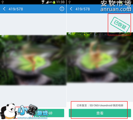 3、通过缩略图预览已删除照片列表,找到我们需要找回的图片,点击恢复照片会被保存到手机相册中,再退到刚才已删除照片缩略图列表界面,是不是很强大呢?恢复成功以后如图所示: