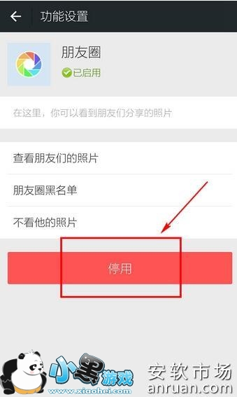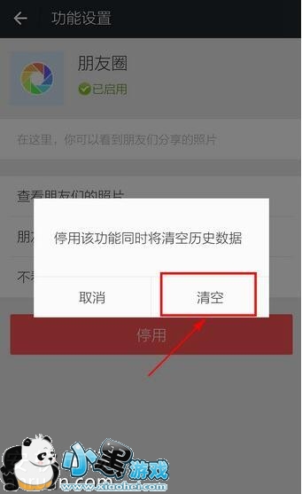 3、最后,在功能里面找到【朋友圈】,选择【停用】,在弹出选项里选择【清空】,如图:
