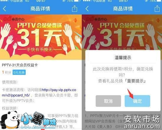 2、然后选择立即兑换,其实就是用饿了么1积分兑换PPTV31天会员激活码,到时候登录账号输入会员卡密即可升级成PPTV会员: