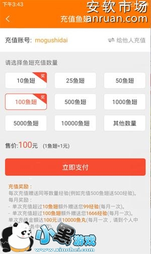 3、最后,在充值页面,可以看到100块钱可以买100个鱼翅,也就是1鱼翅=1元,按照自己的需要进行充值: