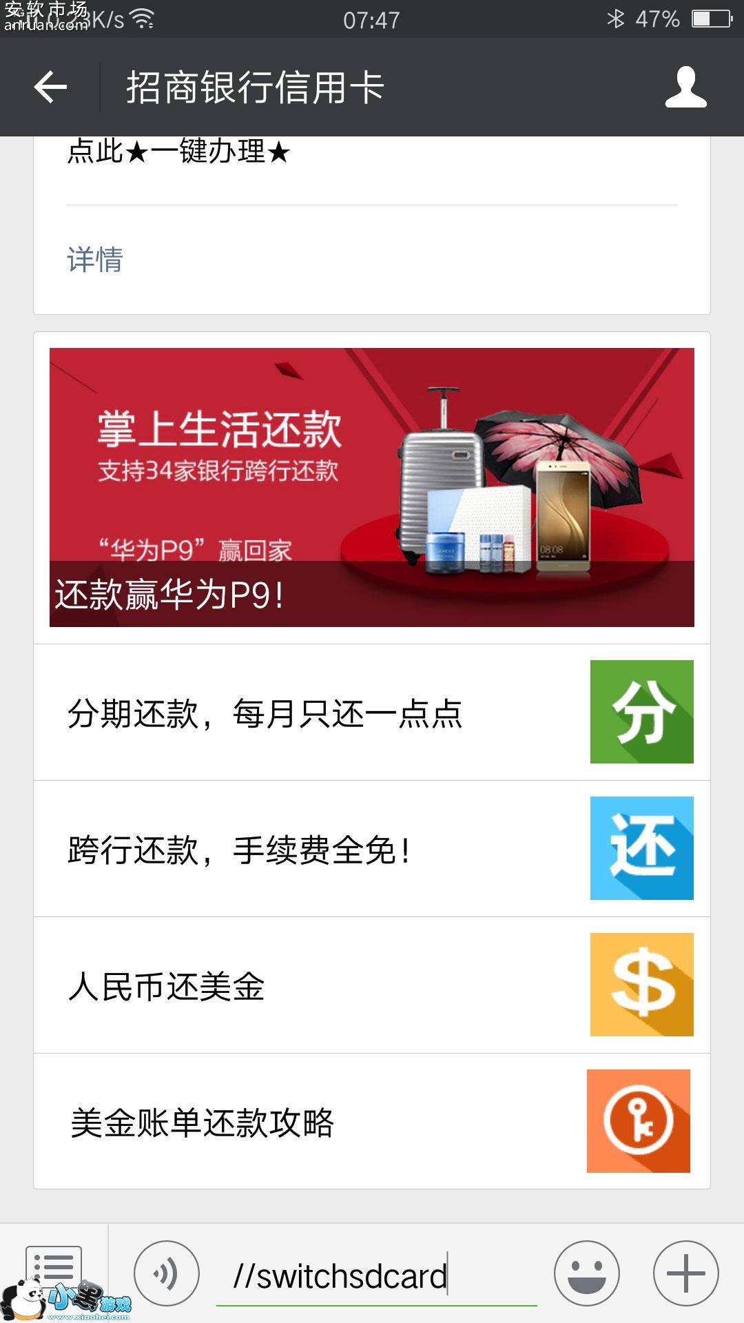 方法二:已安装的微信,在微信任意聊天界面输入 “//switchsdcard” (不含引号)→发送→会弹出移动到SD卡的对话框,按提示操作;
