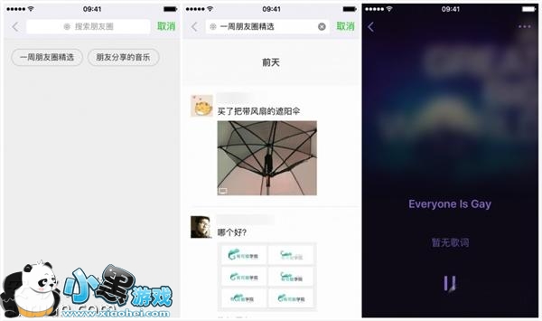 「一周朋友圈精选」会用机器学习算法从你的朋友圈中按照一定规律筛选朋友圈,然后把权重较高的内容会优先显示。「朋友分享的音乐」会将好友在朋友圈中分享过的音乐按照时间先后顺序筛选整合起来,可以当作歌单来收听,在播放页面中左右滑动可以切换歌曲。