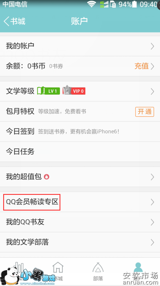 然后,我们就可以看到有个“阅读”的选项,点击阅读!其它这样我们还是进入了QQ书城!再在书城中找到“帐号”选项,如上图!然后我们再点周会员畅读专区,这样我们就可以在QQ书城中免费畅读了!