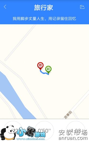 6、在轨迹记录界面点击“停止”按钮,在新的界面就可以看到自己的运动轨迹、总距离、用时和平均速度。
