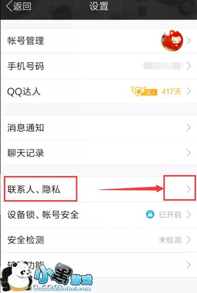 2、进入到设置界面以后,可以看到一个“联系人、隐私”的功能选项,点击该功能进入,如下图
