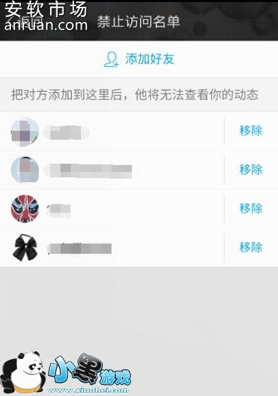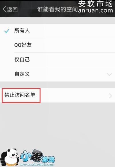 谁能看我的空间下面还有一个“禁止访问名单”,与自定义设置指定人可见正好相反,只要将对方添加到禁止访问名单里,对方就不能查看我们的动态了。