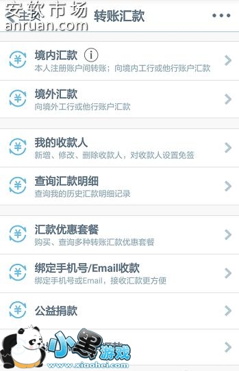 5、返回主界面,点击转账汇款,可以看到各种汇款功能,如下图所示
