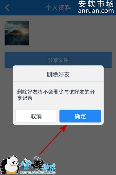 6、点击以后,会弹出一个“删除好友将不会删除与该好友的分享记录”窗口,点击确定按钮即可,如下图所示