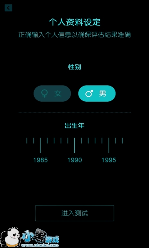 1、首先下载在手机上下载安装好大脑测试BrainEV这款应用,运行打开会弹出一个个人资料设定的界面,大家根据自己的出生年月、性别对应选好,之后点击进入测试。