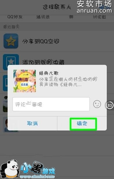 4、接着将会打开手机中的登录的QQ,进行好友的选择,选择好友之后,点击弹出选项,点击确认发送,如下图所示