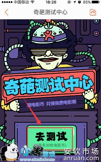 5、还可以点击“电影活动营”中的“奇葩测试有礼”这个功能,然后在“奇葩测试中心”页面我们再点击“去测试”按钮来参加竞猜。有机会可以获得30枚电影币哦。