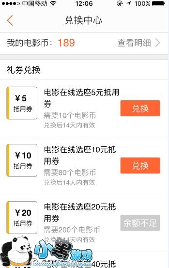 7、在“兑换中心”界面中,我们可以看到当前自己的电影币数量,还可以看到不同的电影币可以兑换的抵用券情况。