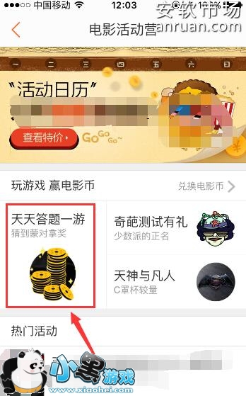 3、进入到“电影活动营”界面以后,点击点击“天天答题一游”这个功能,通过回答软件出的题目来获得电影币,如下图所示