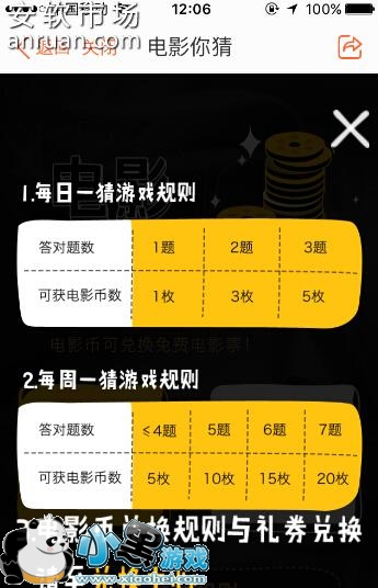 4、在里面有每日一猜和每周一猜两个活动,答对了相对应的题数后我们就能获得应有的电影币了。具体大家可以看下图中所示的内容。
