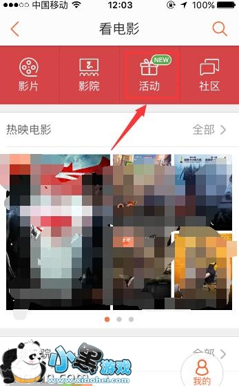 2、进入到看电影界面以后,在界面中间有一个“活动”的功能选项,点击该功能进入,如下图所示