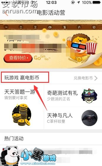 6、当获得了足够多的电影币后,我们可以点击“电影活动营”中的“玩游戏赢电影币”功能选项来兑换电影票,如下图所示