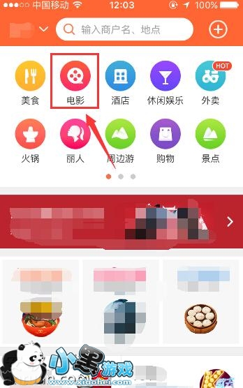1、打开大众点评客户端,进入到大众点评主界面以后,点击主界面上“电影”这个功能选项,如下图所示