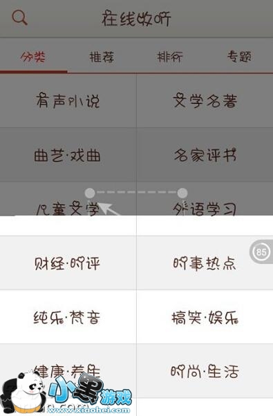 1、打开懒人听书客户端,进入到懒人听书主界面,然后在“在线收听”中包含有许多的书籍分类,点击自己的选择,如下图所示
