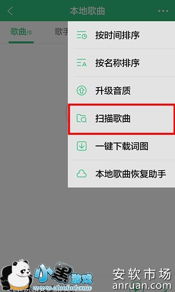3、点击右上角的三点标识,会出现一个下拉选项,选择点击扫描歌曲开始扫描歌曲